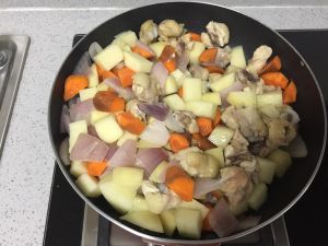 再炒熟土豆和胡萝卜,加鸡肉,加水焖