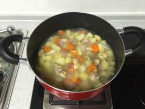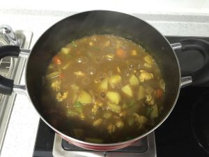 加入已经煮开的鸡腿骨水…此时新手可以边尝边加水和咖喱酱来调味…加入盐…尝尝味道对了没有…ok之后盖上中火锅盖炖煮15分钟