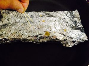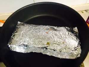 用牙签在锡纸上扎些洞将鱼翻面,鱼皮朝下中火烤8分钟即可