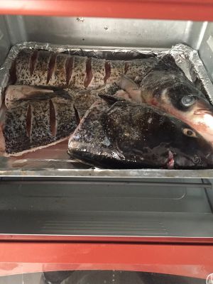 将鱼平铺在烤盘上,抹上一层油,在身上撒上调好的辣椒面(辣椒面、花椒面、孜然粉、味精拌匀)。进入烤箱210度上下火烤30分钟(烤箱提前预热好了)。
