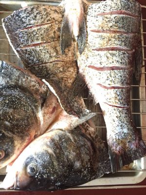 一般烤鱼都用草鱼。今天买了花鲢,3斤左右,调整一下位置,刚好放下。鱼洗净晾干水分,鱼身两侧切斜口。均匀的倒入少量黄酒,醋。正反面撒上花椒粉,胡椒粉,盐。盐量就看着上,盐少就腌制时间长点,急用就盐多点。