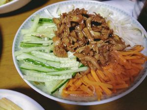 最后出锅,把黄瓜丝,萝卜丝,大葱丝摆盘淋上肉丝和酱汤,就OK啦