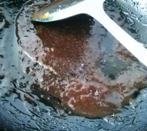 锅中再次放入食用油,凉油倒入甜面酱2大勺,大约50g左右快速翻炒;