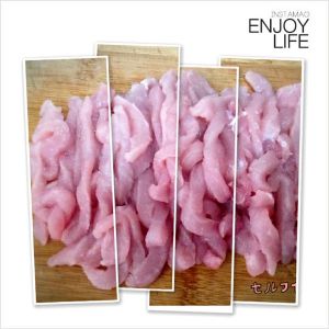 小葱、姜蒜切末,猪里脊肉切成细丝。 *稍微冻一下会比较好切