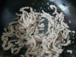 热油倒入味好的肉丝,翻炒熟后盛出
