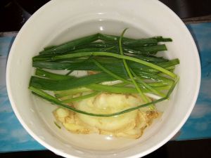 大葱切丝(可以多弄点留着后面用),生姜,少许水泡着,十到十五分钟,味道泡出来就行