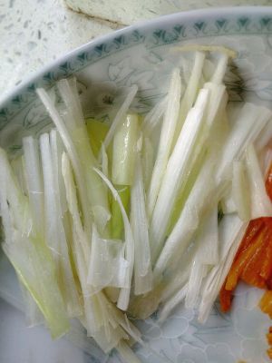 葱白切成细丝,姜切丝后用冷水浸泡;