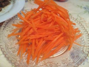 将胡萝卜、大葱、黄瓜洗净切成丝,香菜洗净备用。