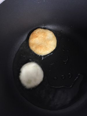 将加过面粉(定形)后成的土豆饼雏形放进平底锅里炸,记得用小火来做,否则会影响土豆饼的色泽。