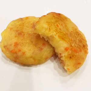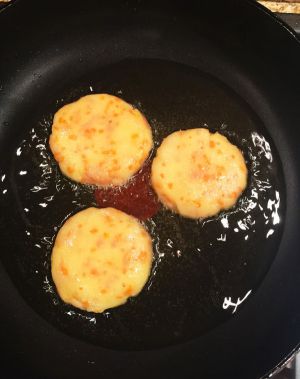 然后平底锅刷油,把搅拌好的土豆泥还有面粉用勺子一个个放好在煎锅里,然后翻面直到熟