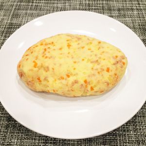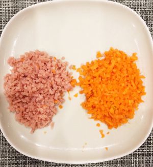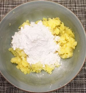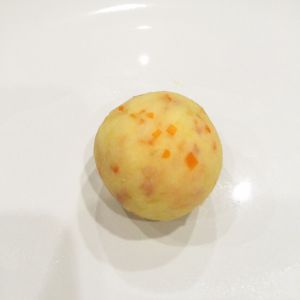 在土豆泥中加入面粉、胡萝卜丁和火腿丁还有一点点盐