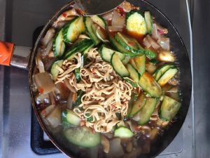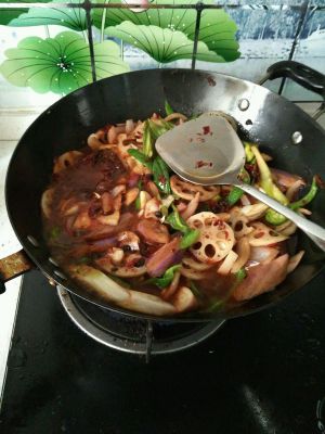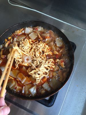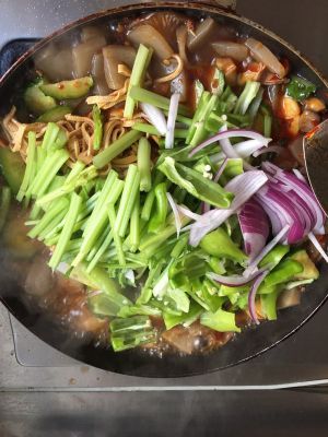 炒锅中加油烧热,先入大蒜洋葱爆香,后放入其它配菜,爆炒两分钟后加半包豆瓣酱和水,煮约三四分钟至熟。