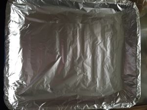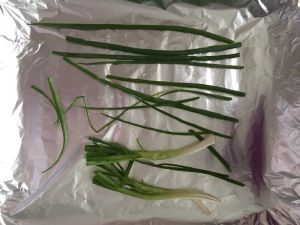 第十二步:把韭菜均匀铺在烤盘上。再在料上面均匀刷上植物油。