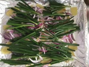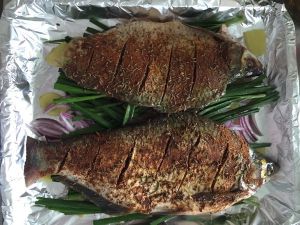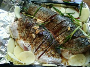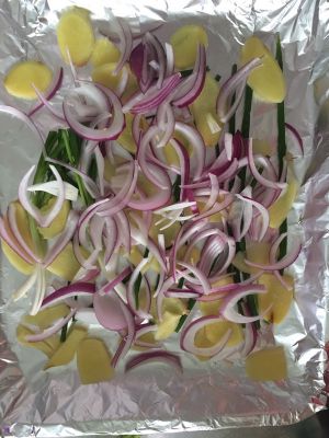 烤盘中铺上锡纸,底部铺上土豆片,将鱼放置于上,浇上蒸鱼豉油,以及少量之前的腌料,盖上一层锡纸,放入烤箱中上下190°烤约半小时。