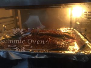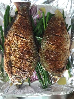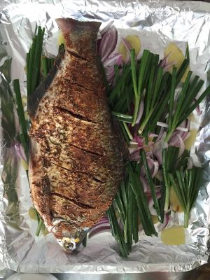 放入烤箱中层,烤20分钟,取出,撒上葱花,在烤5分钟,好吃的极品香辣烤鱼出炉了。