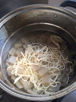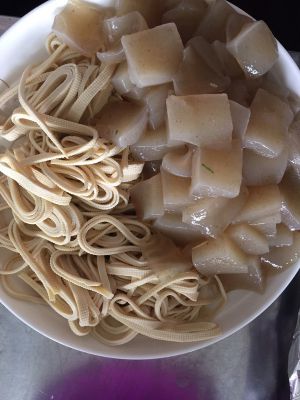 第十九步:把魔芋豆腐和千张用热水焯一下。