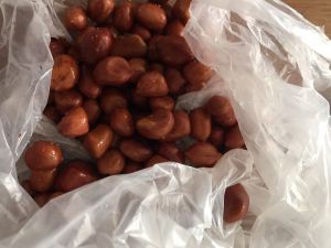 在流口水之余把调料包和配菜全部搞好,锅中加油预滴热热滴,上图那两包呼啦扔里面使劲炒,加点水,水取决于你烤鱼盘多深,有多深水加多深,因为后面配菜需要水的滋润
