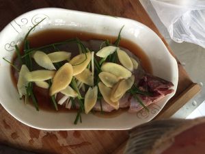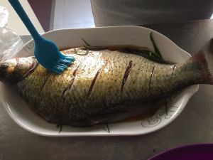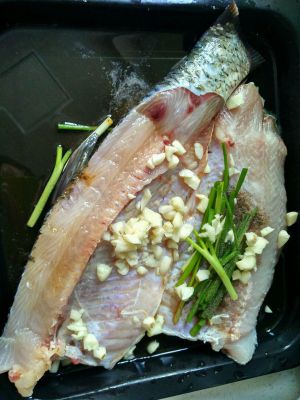 草鱼分两片,背上划几刀,用盐、大蒜、葱、料酒、蒸鱼豉油等腌制约半小时。