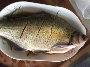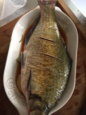 第一步:买回来处理干净的鱼,把鱼由背面破开,在鱼背上用刀划出几道,然后用盐、料酒、生抽、混合腌制。