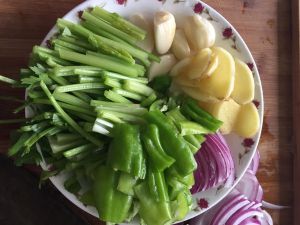 第五步:把芹菜、辣椒、洋葱、姜片、大蒜洗干净切好备用。