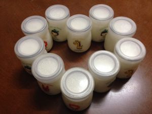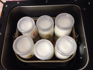 牛奶倒入酸奶瓶子中,我用了12个瓶子,面包机内胆可放块干净的毛巾,这样酸奶瓶子比较容易放