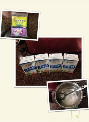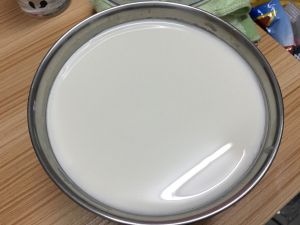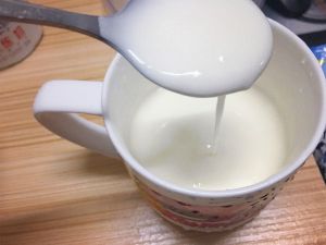 再把牛奶倒入。充分搅拌,让糖融掉,再放进面包机内,按酸奶制作即可。