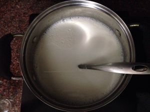 1L纯牛奶加入60g的白糖,中小火加热至糖溶解,这时锅壁摸起来温热不烫手即可。