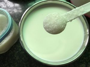 加入一小包的酸奶发酵剂1g,用勺子稍微搅拌均匀。(切忌搅拌过度,牛奶会产生太多气泡)