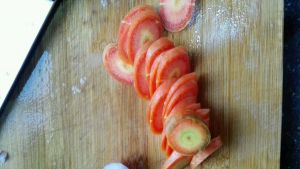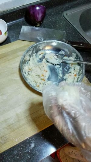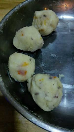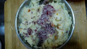 土豆煮熟捣成泥,加入生粉,大葱,和香菜,以及你想要加的颜色,