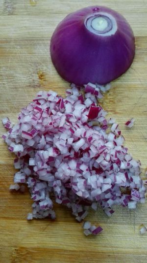 蒸的过程中将洋葱切碎~量根据自己喜欢吃洋葱的程度,个人比较爱吃洋葱,因为洋葱和土豆搭在一起真的是绝配~