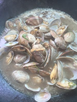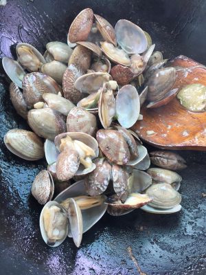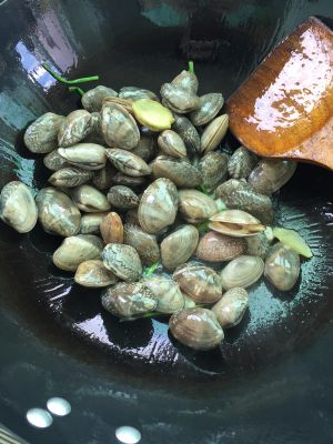 放入花蛤,烹入料酒去腥,翻炒2分钟,放入海鲜酱油蚝油,继续翻炒,等待蛤蜊全部都张开壳了,撒点味精就可以出锅了