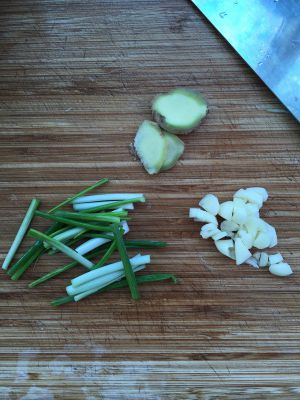切配菜,洋葱半颗,姜片四片,大蒜去头拍扁,干辣椒剪圈,香菜切大段~