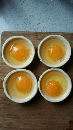 鸡蛋打入蛋挞皮内,选小一点的一个刚好。