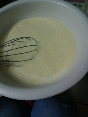 牛奶+奶油+糖粉+炼乳搅拌,加入蛋黄继续搅拌,最后加低筋面粉搅拌均匀后过筛一次