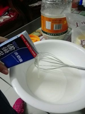 牛奶、淡奶油和糖倒入碗中搅拌