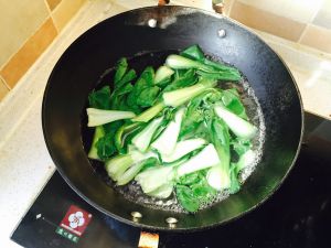 锅内放入少许油,中火下油菜煸炒一分钟。加入0.5小勺食盐。