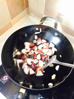 炒香后加入香菇,中火炒,加入酱油,蚝油,味精调味。(盐最后放)