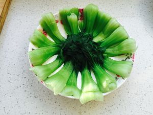 摆盘如图,油菜不用油炒,焯水后捞出摆盘就行。