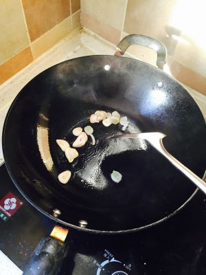 重新起锅,热锅凉油,油7成热时放入葱丝和蒜片,炒香。