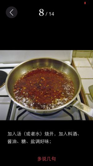 加入料酒烹香,下入两勺盐、一大勺陴县豆瓣、一大勺麻辣酱,加半锅水煮沸后改小火焖煮二十分钟;
