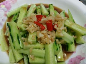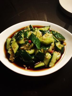用洗净的盘子装好切块的黄瓜,加入盐的时候可以根据黄瓜的份量加入,然后搅拌,过两分钟就看到黄瓜出水,将出水的汁倒掉,加入蒜米搅拌均匀,然后加入糖,搅拌。如果你喜欢吃酸的可以加入陈醋,可以根据个人的口味加入。最后一步加入适量的生抽,然后搅拌,放入冰箱冷藏一下就可以做出完美的味道了。是不是很简单,赶紧动手吧