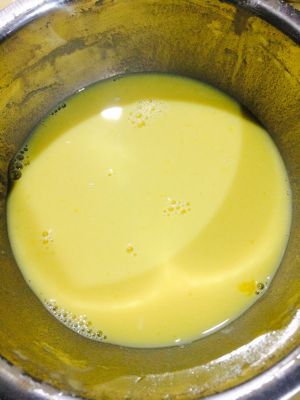蛋黄打散,缓缓倒入牛奶中,搅拌均匀(我这里用的是50克左右的蛋蛋)