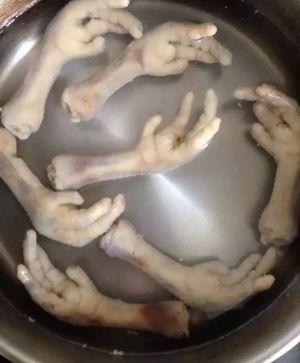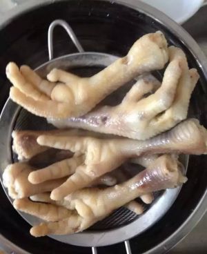 鸡爪用水煮开去浮沫,水中倒点料酒,除腥味。