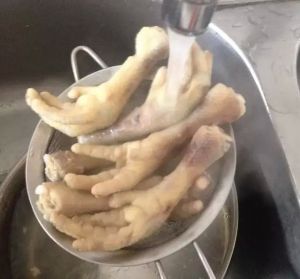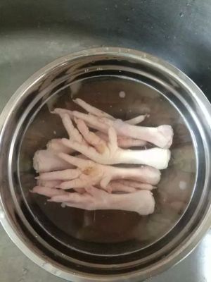 鸡爪洗净,把指甲盖剁了,不剁也行,然后一分两半一个鸡爪