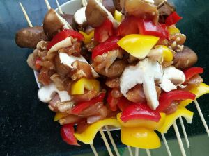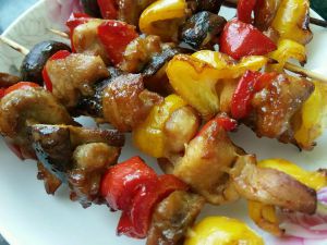 用竹签把所有材料间隔的穿好,进烤箱200度20分钟左右就熟了,中间可以拿出来刷一点酱,这样颜色和味道更好一点,我刷的自己用耗油食用油生抽辣椒混合的酱,不放辣椒就偏甜口