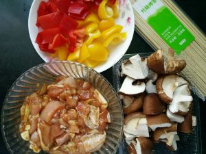 鸡腿去骨切小块,彩椒香菇切块,葱姜蒜切好备用