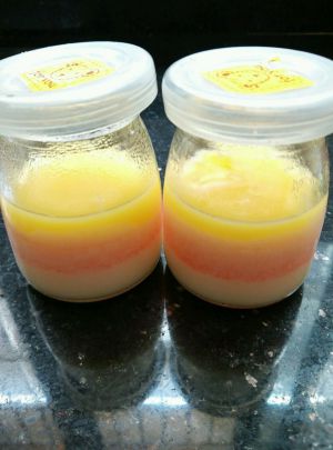 2.倒入成器中,然后用保鲜膜盖住,放入冰箱中的冷冻中,这样凝固的快点。等个10几分钟就开始下一层。同上的做法。