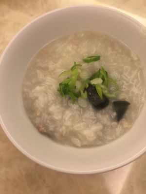 然后锅中烧开水,把闷好的大米倒进去,瘦肉倒进去,煮,然后煮开后小火,在放入松花蛋,熬~根据咸淡可以酌情加盐。然后在出锅前滴一滴香油,放入葱花。然后出锅。