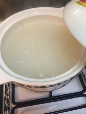 砂锅水开后加入冷冻过的大米。Ps:皮蛋粥请选择砂锅,皮蛋会腐蚀铁锅的,没有也可用其他代替!