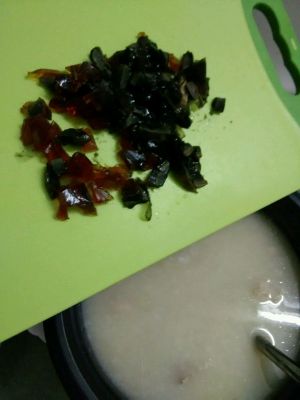 3.等到鸡肉范白后,米煮熟,改成小火煮,同时加入切好的皮蛋
